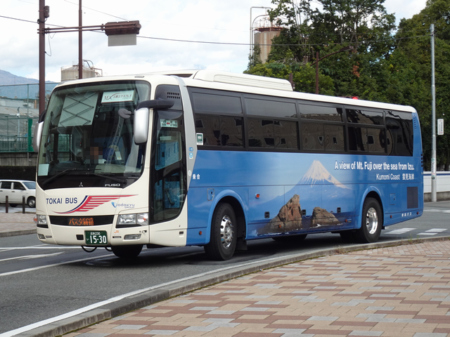 10月から「海越しの富士山を見に行こうキャンペーン」ラッピングが施された東海バスのエアロエース(三菱製)。 三島駅前にて |